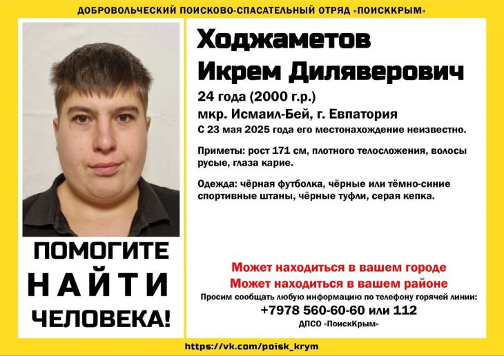 В Евпатории в микрорайоне Исмаил-Бей ушёл из дома и не вернулся Икрем Ходжаметов. По информации добровольческого поисково-спасательного отряда «ПОИСККРЫМ» молодого человека ищут с 23 мая.