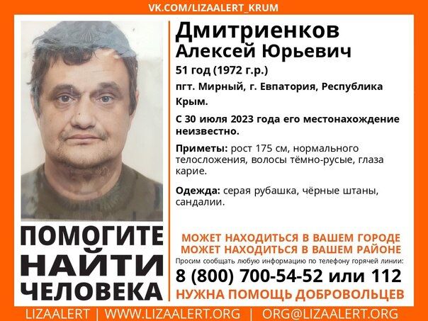 Волонтёры крымского отделения поискового отряда «Лиза Алерт» разыскивают 51-летнего Алексея Дмитриенкова из пгт Мирное под Евпаторией.