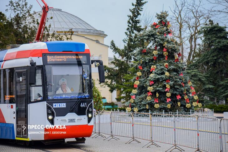«По городу курсируют два трамвая под управлением Снегурочек, ещё в двух вагонах билеты продают кондукторы в костюмах внучки Деда Мороза», — рассказали в пресс-службе администрации Евпатории.