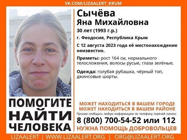 В Феодосии пять дней назад без вести пропала 30-летняя Яна Сычёва. Об этом сообщили в поисковом отряде «ЛизаАлерт» Крым.