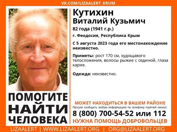В Феодосии без вести пропал 82-летний Виталий Кутихин. С 5 августа о его местонахождении ничего неизвестно. Об этом сообщили в поисковом отряде «ЛизаАлерт» Крым.