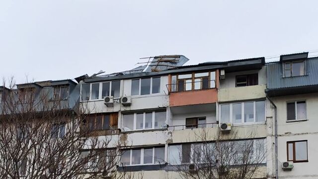 В Феодосии из-за сильного ветра над двумя подъездами шестиэтажного многоквартирного жилого дома наполовину была сорвана крыша из металлочерепицы. Об этом сообщили в пресс-службе МЧС РК.