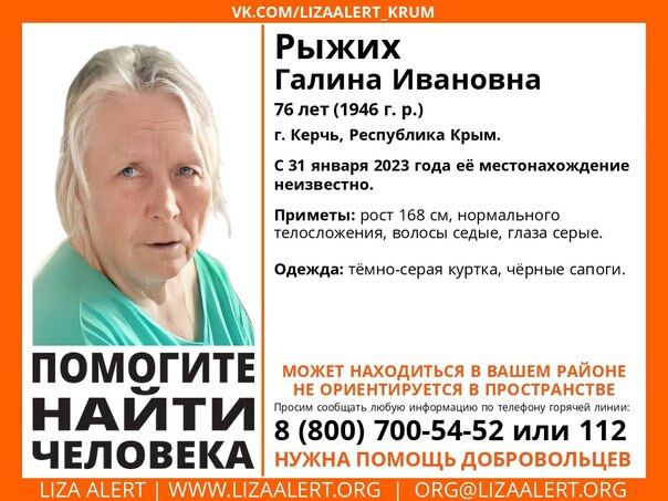 В Керчи 31 января без вести пропала 76-летняя Рыжих Галина Ивановна. До сих пор о ее местонахождении ничего неизвестно. Об этом корреспонденту Крымского информационного агентства сообщили в поисковом отряде «ЛизаАлерт Крым».