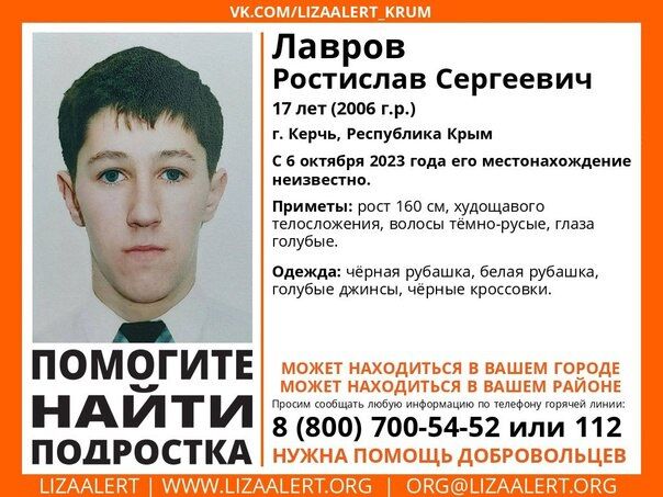 Волонтёры крымского отделения поискового отряда «Лиза Алерт» в Керчи разыскивают 17-летнего Ростислава Лаврова, чьё местонахождение неизвестно с 6 октября этого года.