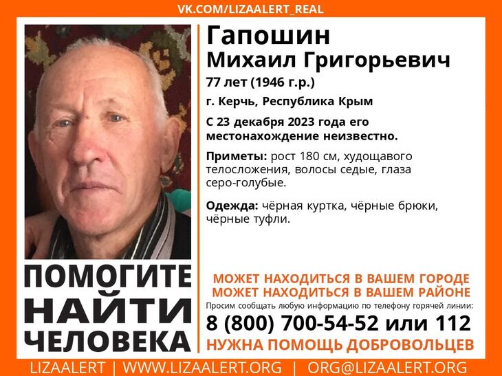 23 декабря мужчина ушёл из своего дома в Керчи и не вернулся. Ростом 180 см, худощавого телосложения, серо-голубые глаза, седые волосы. Был одет в чёрную куртку, чёрные брюки и чёрные туфли.