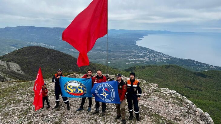 В самый главный праздник страны спасатели традиционно водружают Знамя Победы на вершинах крымских гор.
