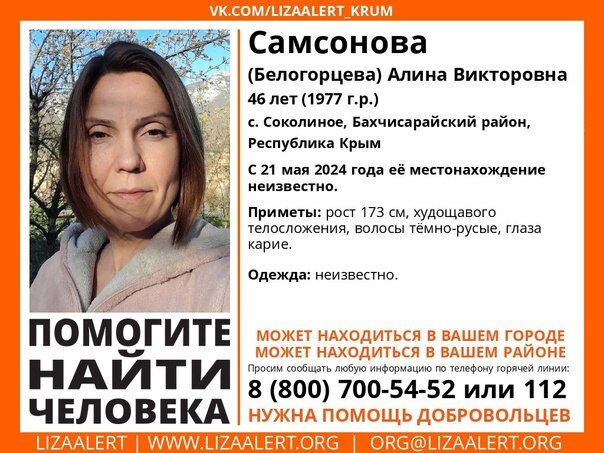 Алина Викторовна Самсонова (Белогорцева) пропала в селе Соколином Белогорского района. Поиски женщины ведутся с 21 мая. Об этом сообщил поисково-спасательный отряд «Лиза Алерт» Крым.