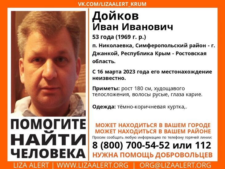 В Крыму 53-летний пропал Иван Дойков, с 16 марта о его местонахождение ничего неизвестно. Об этом сообщили в «ЛизаАлерт Крым».