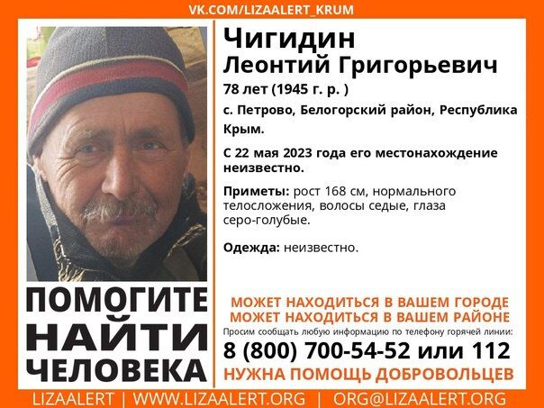 В селе Петрово, Белогорского района без вести пропал 78-летний Леонтий Чигидин. С 22 мая о его местонахождении ничего неизвестно. Об этом сообщили в «ЛизаАлерт» Крым.