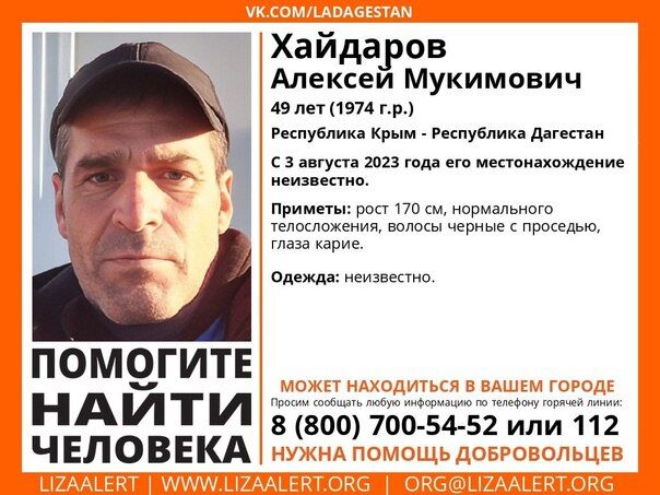 49-летний Алексей Хайдаров, житель Дагестана без вести пропал 3 августа. С тех пор о нем ничего неизвестно, может находиться на территории Крыма. Об этом сообщили в поисковом отряде «ЛизаАлерт» Крым.