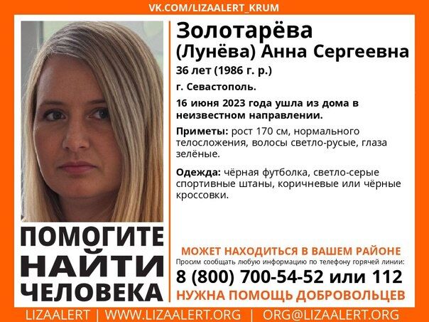 Также в Севастополе без вести пропала 36-летняя Анна Золотарева (Лунева). Она ушла из дома 16 июня, с тех пор о ее местонахождение ничего неизвестно.
