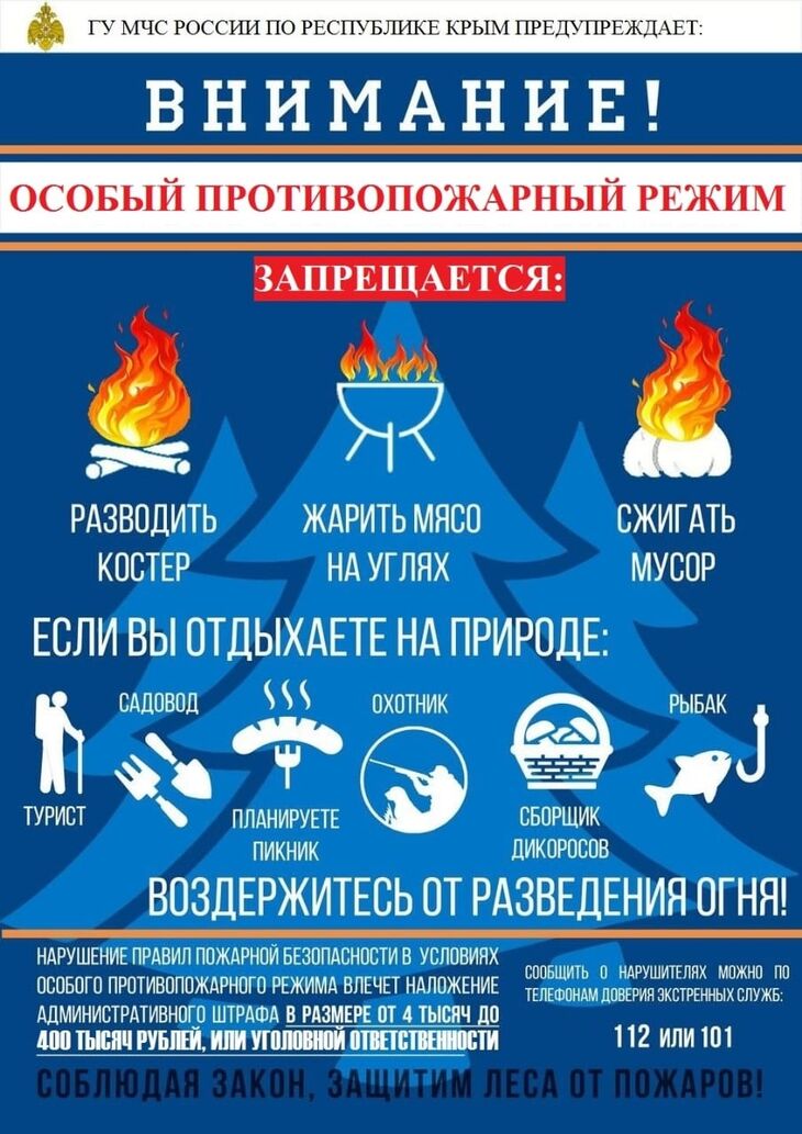 В связи высокой пожарной опасностью с 10 апреля 2020 года на всей территории полуострова установлен особый противопожарный режим. Это подразумевает под собой дополнительные требования по соблюдению правил пожарной безопасности жителями и гостями Республике Крым.