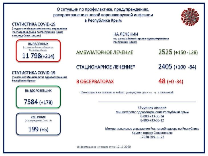 Межрегиональным управлением Роспотребнадзора по Республике Крым и городу Севастополю всего выявлено 11798 положительных на Covid-19. Выписано с выздоровлением — 7584.