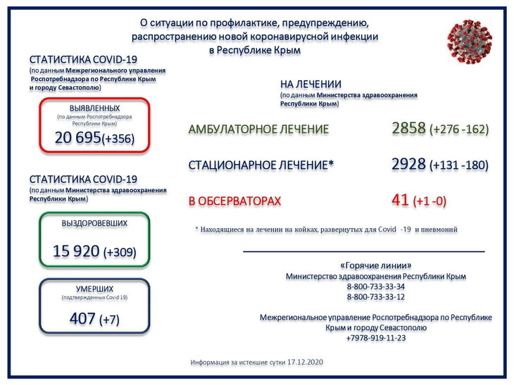 Межрегиональным управлением Роспотребнадзора по Республике Крым и городу Севастополю всего выявлено 20695 положительных на Covid-19. Выписано с выздоровлением — 15920.