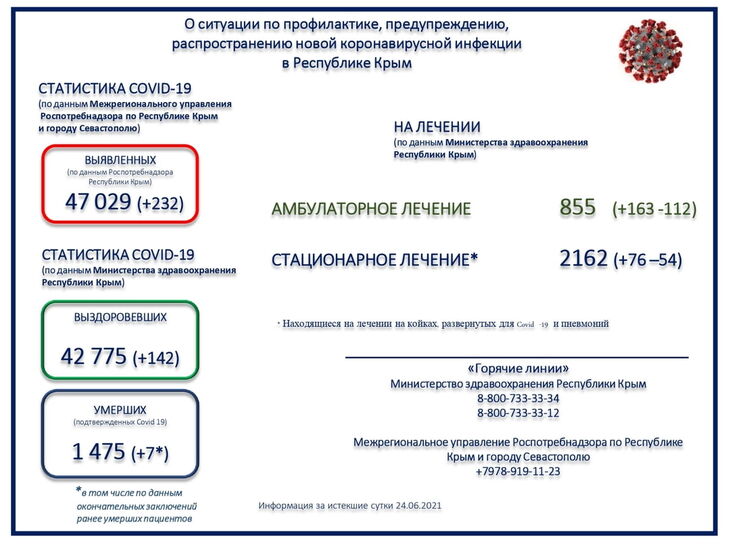Межрегиональным управлением Роспотребнадзора по Республике Крым и городу Севастополю всего выявлено 47029 положительных на Covid-19. Выписано с выздоровлением — 42775.