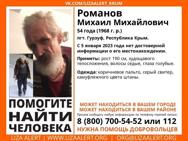 С 5 января 2023 года нет достоверной информации о местонахождении Романова Михаила Михайловича 1968 года рождения. Об том сообщили в поисковом отряде «Лиза Алерт» Крым.
