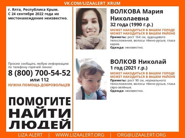 В Ялте 24 сентября без вести пропала Волкова Мария Николаевна, 1992 года рождения и Волков Николай, 2021 года рождения. Об этом сообщили в пресс-службе «ЛизаАлерт Крым».