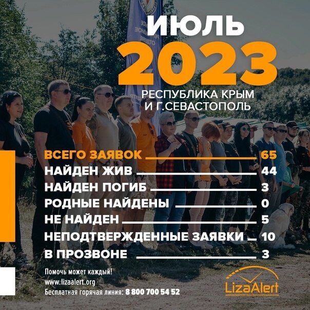 Поисковый отряд «ЛизаАлерт» Крым в июле принял 65 заявок на поиск людей. Из них 10 не подтвердились.