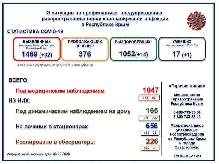 Межрегиональным управлением Роспотребнадзора по Республике Крым и городу Севастополю всего выявлено 1469 положительных на Covid-19. Лечение в медицинских учреждениях Республики Крым проходят 376 человек, выписано с выздоровлением — 1052.