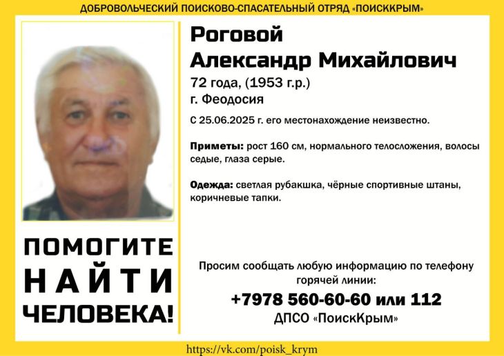 В Феодосии со вчерашнего дня ведутся поиски 72-летнего Александра Рогового. О местонахождении пожилого мужчины больше суток ничего не известно, сообщает добровольческий поисково-спасательный отряд «ПОИСККРЫМ».