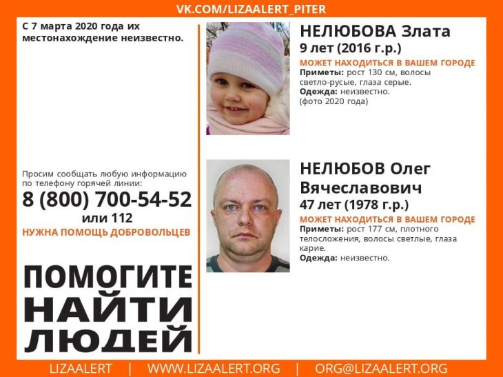 Всех, кто обладает какой-либо информацией о местонахождении Златы и Олега Нелюбова, просим сообщить об этом по круглосуточной бесплатной горячей линии отряда «ЛизаАлерт»: 8 (800) 700-54-52 или по номеру экстренных служб 112. Любая информация, даже кажущаяся незначительной, может оказаться важной для поиска.