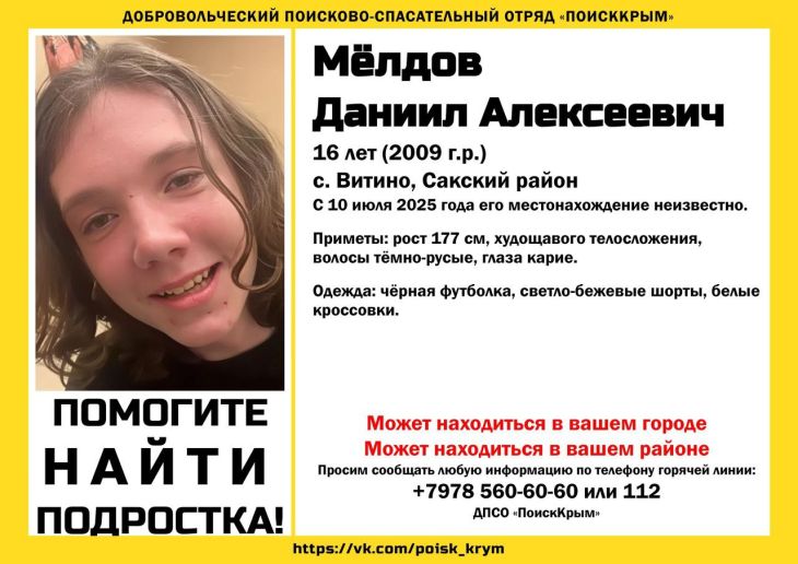 В Сакском районе селе Витино ведутся поиски 16-летнего Даниила Мёлдова. Как сообщили в добровольческом поисково-спасательном отряде «ПОИСККРЫМ», парень ушёл из дома 10 июля и до сих пор его местоположение остается неизвестным.