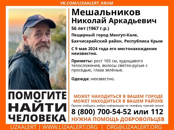 Николай Мещальников исчез в районе пещерного города Мангуп-Кале, Бахчисарайского района. Поиски мужчины ведутся с 9 мая. Об этом сообщил поисково-спасательный отряд «Лиза Алберт» Крым.