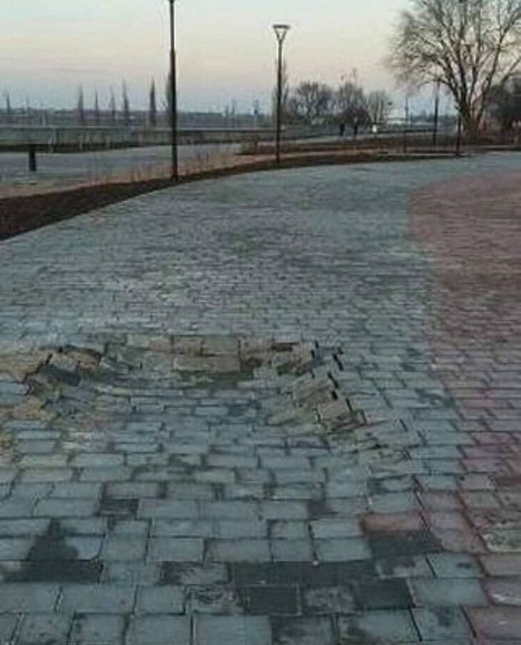 Пользователи социальной сети ВКонтакте выложили фото недавно уложенной плитки на строящейся набережной вокруг Солёного озера, которая «поплыла» после дождя.
