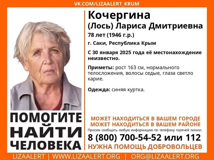 С 30 января о местонахождении Ларисы Кочергиной (Лось) неизвестно. Предположительно женщина может находиться в Саках. Об этом сообщил поисково-спасательный отряд «ЛизаАлерт».