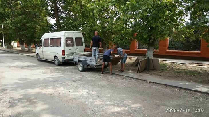 Глава администрации Сак Александр Овдиенко выложил на своей странице в Facebook фото, на котором видно, как группа людей снимает плитку и складирует в прицеп автомобиля.