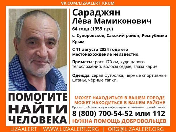 В селе Суворовском (Сакский район) вышел из дома и не вернулся Лёва Мамиконович Сараджян. Поиски мужчины ведутся третьи сутки. Об этом сообщил поисково-спасательный отряд «Лиза Алерт» Крым.