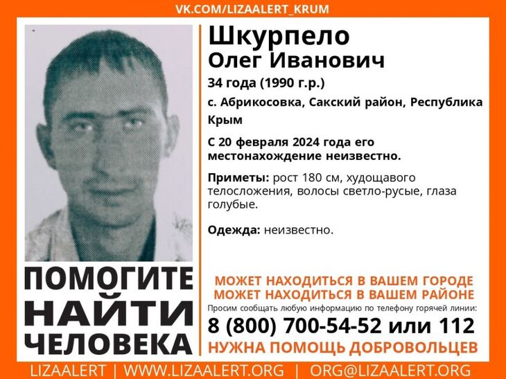 В селе Абрикосовка (Сакский район) пропал Олег Шкурпело. С 20 февраля 2024 года местонахождение мужчины неизвестно. Об этом сообщил поисково-спасательный отряд «Лиза Алерт» Крым.