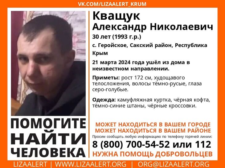 21 марта ушел из дома и не вернулся Александр Кващук из села Геройское. Об этом сообщили в пресс-службе поисково-спасательного отряда «ЛизаАлерт».