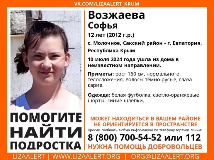 Сегодня ушла из дома и не вернулась Софья Возжаева из села Молочное. Об этом сообщил поисково-спасательный отряд «ЛизаАлерт».
