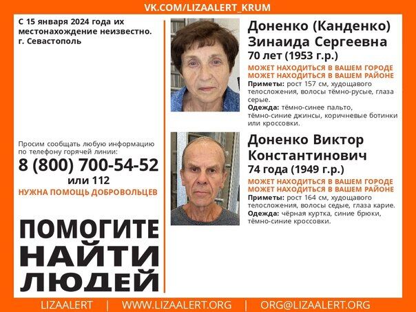 15 января Зинаида и Виктор Доненко вышли из дома и не вернулись. Об этом сообщил поисково-спасательный отряд «ЛизаАлерт».