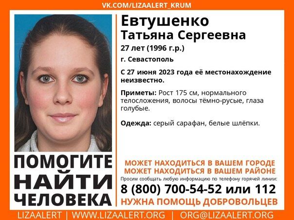 В Севастополе ушла из дома и не вернулась 27-летняя Татьяна Евтушенко. С 27 июня о ее местонахождении ничего неизвестно. Об этом сообщили в поисковом отряде «ЛизаАлерт» Крым.