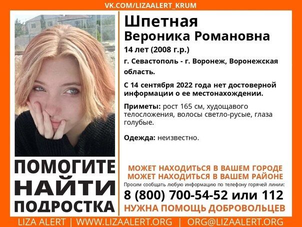 14 сентября без вести пропала Шпетная Вероника Романовна 2008 года рождения. Предположительно может находиться в Севастополе-Воронеже, Воронежской области. Об этом сообщили в пресс-службе поискового отряда «ЛизаАлерт Крым».