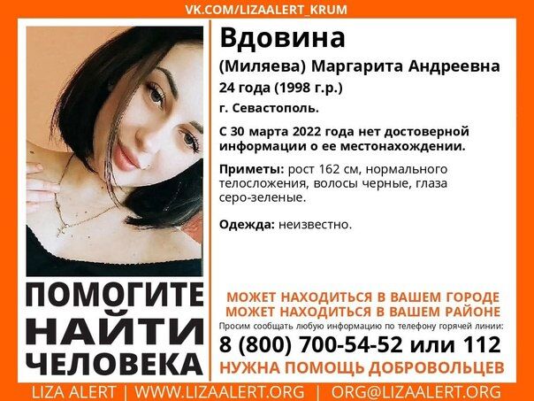 В Севастополе 30 марта пропала Вдовина (Миляева) Маргарита Андреевна, 1998 года рождения. Об этом сообщили в поисково-спасательном отряде «ЛизаАлерт».