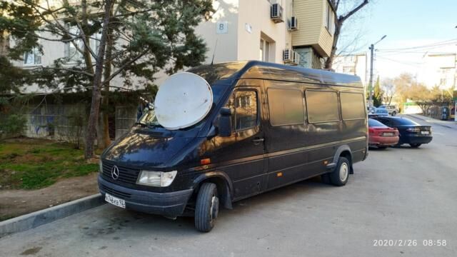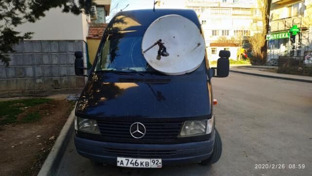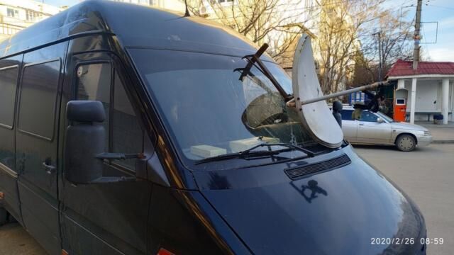 В Севастополе, в Казачьей бухте, ветер снес с крыши многоэтажки спутниковую антенну на лобовое стекло микроавтобуса Mercedes-Benz. Об этом сообщают очевидцы в соцсети.