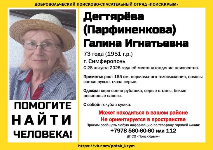 В крымской столице со вчерашнего дня ищут пропавшего 73-летнюю Галину Дегтярёву (Парфиненкову). Поиски пожилой женщины ведутся с 28 августа и пока результатов не дали, сообщает добровольческий поисково-спасательный отряд «ПОИСККРЫМ».