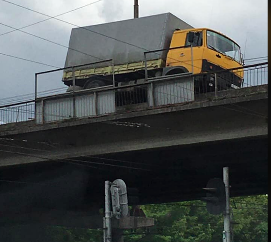 В столице Крыма грузовой автомобиль на мосту через железнодорожное полотно вылетел на бетонный отбойник у края моста. Фото пришествия опубликовали очевидцы в социальных сетях.