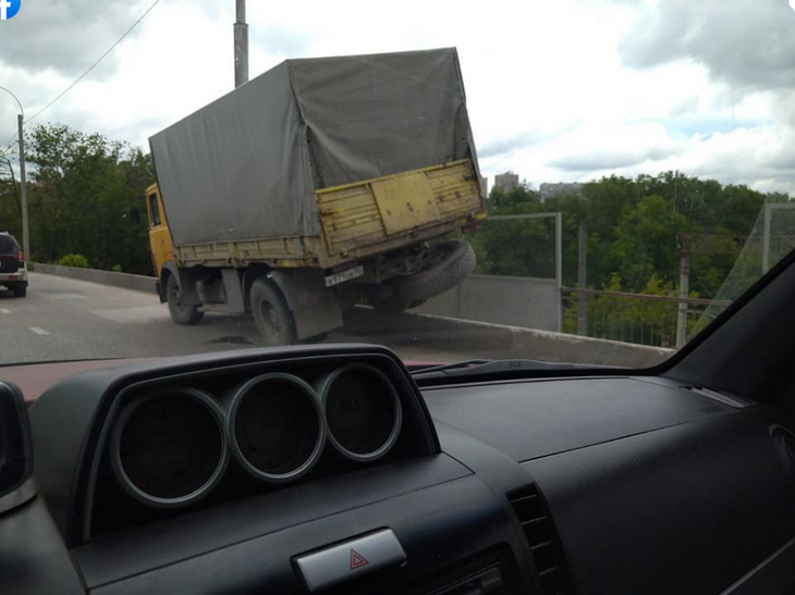 Грузовик КамАЗ едва не слетел с моста на Героев Сталинграда в Симферпроле. Очевидцы в соцсетях пишут, что причиной могло стать ДТП.