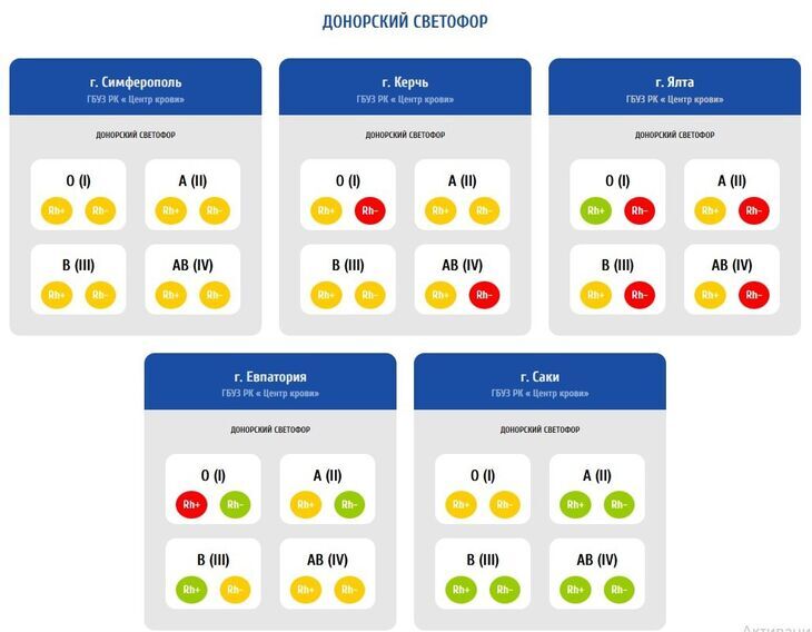 «Очень ждем доноров с группой крови и резус-фактором, которые отмечены в светофоре красным и желтым! Обязательно возьмите с собой паспорт и СНИЛС. Надеемся на вашу помощь в пополнении запасов», – рассказали корреспонденту Крымского информационного агентства в «Центре крови».