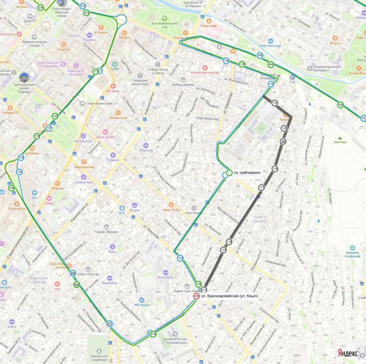 Движение будет осуществляться через: ул. Студенческую → ул. Пограничников → ул. Нижнегоспитальную → ул. Крылова → ул. Красноармейскую, далее — по стандартному маршруту.