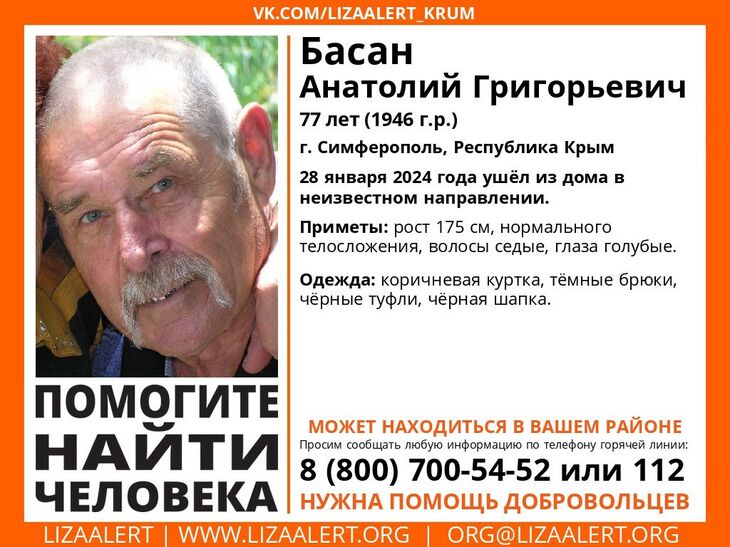 Анатолий Басан ушел из дома 28 января и не вернулся. Об этом сообщил поисково-спасательный отряд «ЛизаАлерт».