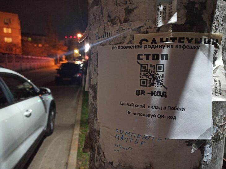 «Не променяй родину на кафешку. Стоп QR-код. Сделай свой вклад в Победу. Не используй QR-код», — написано в объявлениях.