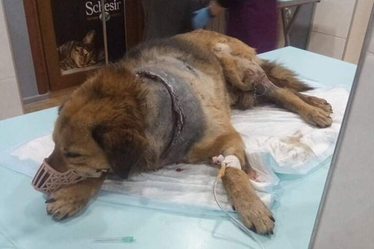 Пес дал надеть себе на горло пакет, и в таком виде его довезли к ветеринарам. Даже видавшие многое сотрудники ветклиники ужаснулись — было видно, что горло резала опытная в этом деле рука.