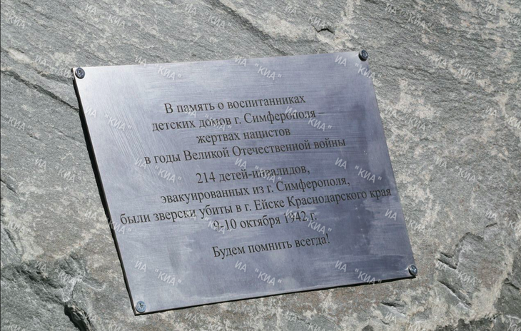 «Сегодня совместно с заместителем Министра просвещения России Денисом Грибовым, сопредседателем Центрального штаба ОНФ и движения «Бессмертный полк» Еленой Цунаевой, начальником УФСБ России по Крыму и Севастополю Леонидом Михайлюком открыли на территории Симферопольской специальной школы-интерната № 2 мемориальный знак в память о жертвах страшной трагедии, которая произошла в октябре 1942 года, когда 214 воспитанников симферопольских детских домов, эвакуированных в годы войны в город Ейск, были уничтожены нацистами. Это преступление не имеет срока давности.