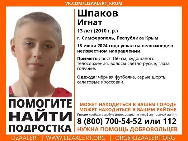 В крымской столице 18 июня пропал Игнат Шпаков. Мальчик уехал на велосипеде в неизвестном направлении. Об этом сообщил поисково-спасательный отряд «Лиза Алерт» Крым.