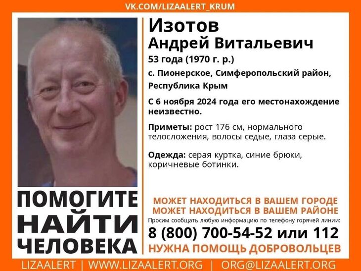 6 ноября ушел из дома и не вернулся Андрей Изотов из села Пионерское Симферопольского района. Об этом сообщили в поисково-спасательном отряде «ЛизаАлерт».